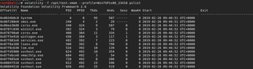 ● 无法显示隐藏/终止的进程—pslist 命令:volatility -f [内存文件] –profile=[配置文件] pslist